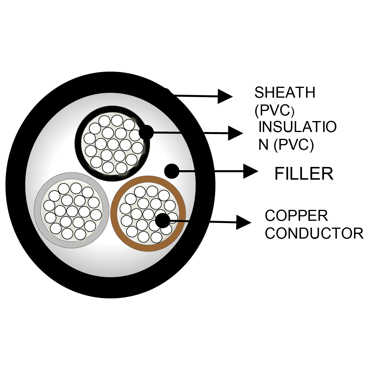 | Слоеви | Three Cores / Copper Conductor / PVC insulated / Filler / PVC Sheath |