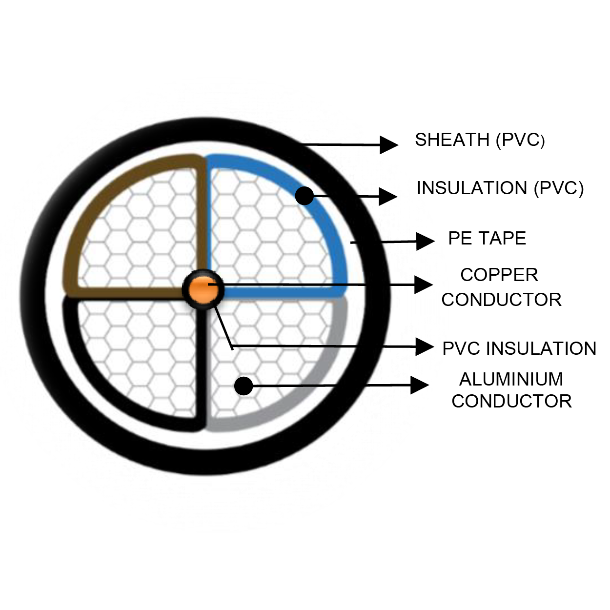 | Layers | Multi Core / Aluminum Conductor / PVC insulated / PE Tape / PVC Sheath |