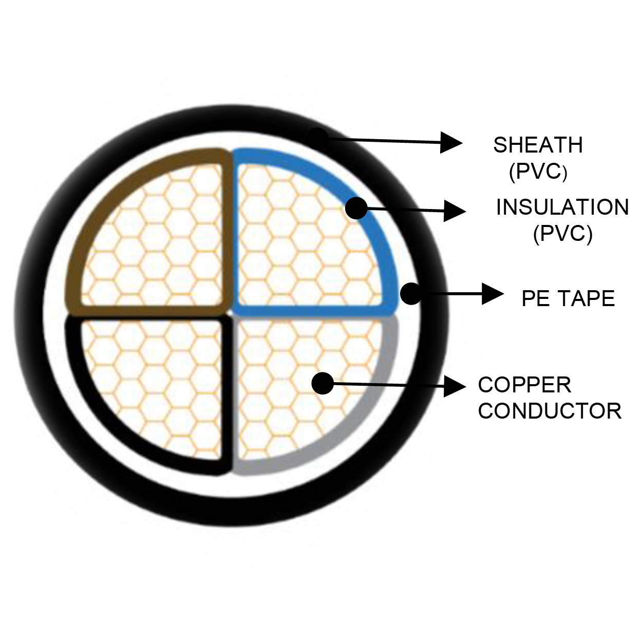 | Layers | Multi Core / Copper Conductor / PVC insulated / PE Tape / PVC Sheath |